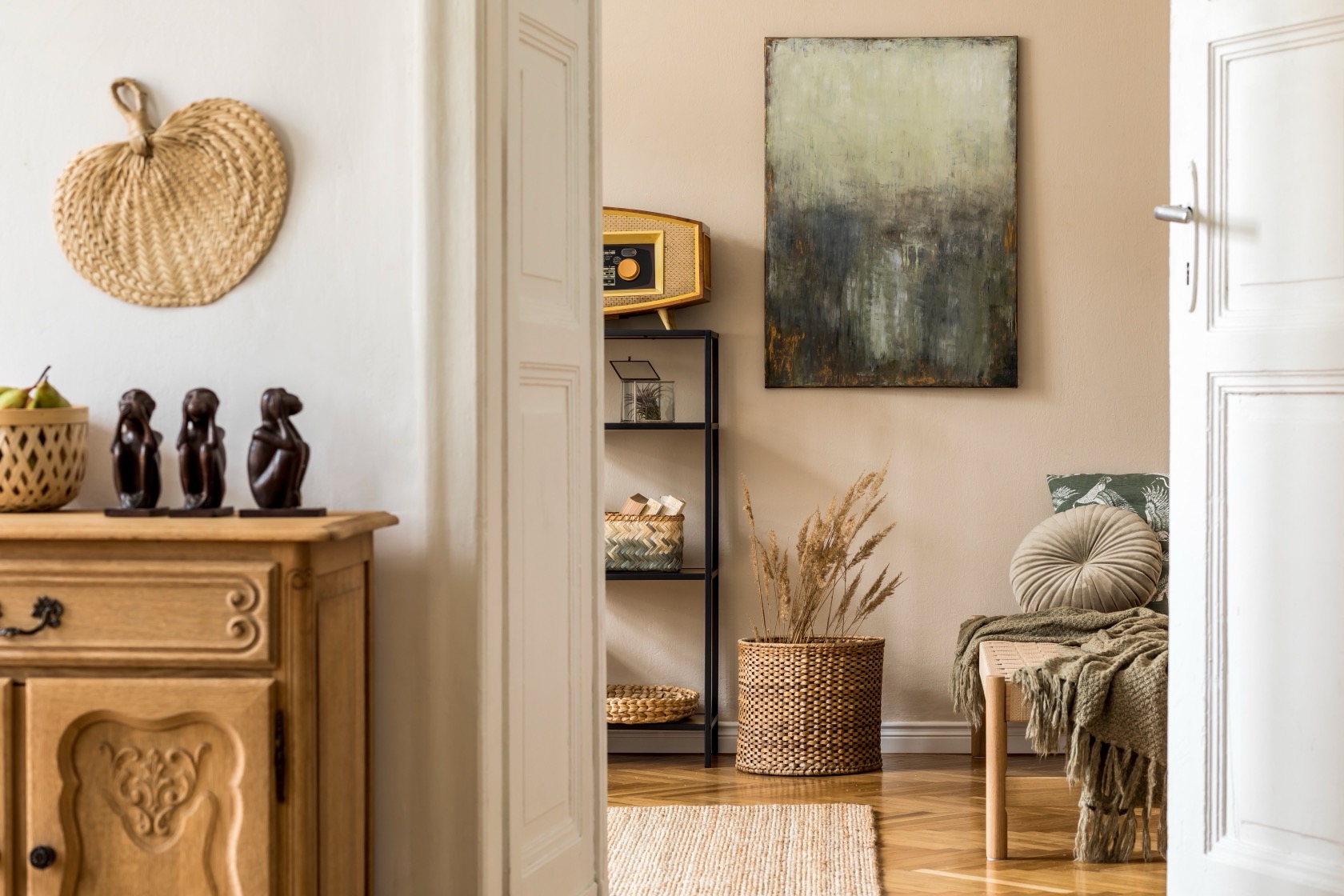 Combina: cuadros antiguos con muebles modernos, esculturas minimalistas junto a alfombras artesanales, grabados contemporáneos en marcos vintage.