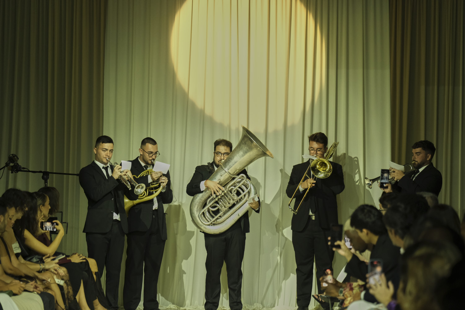 La emoción se intensificó con la música en directo de Lignum Brass, quinteto de metales que interpretó marchas procesionales y piezas sacras especialmente adaptadas. Entre ellas, composiciones de Miguel Ángel Font, Alejandro Blanco y Gámez Laserna, además de la obra central, Parasceve, que reunió marchas icónicas como La Madrugá, Virgen del Valle o Amarguras.