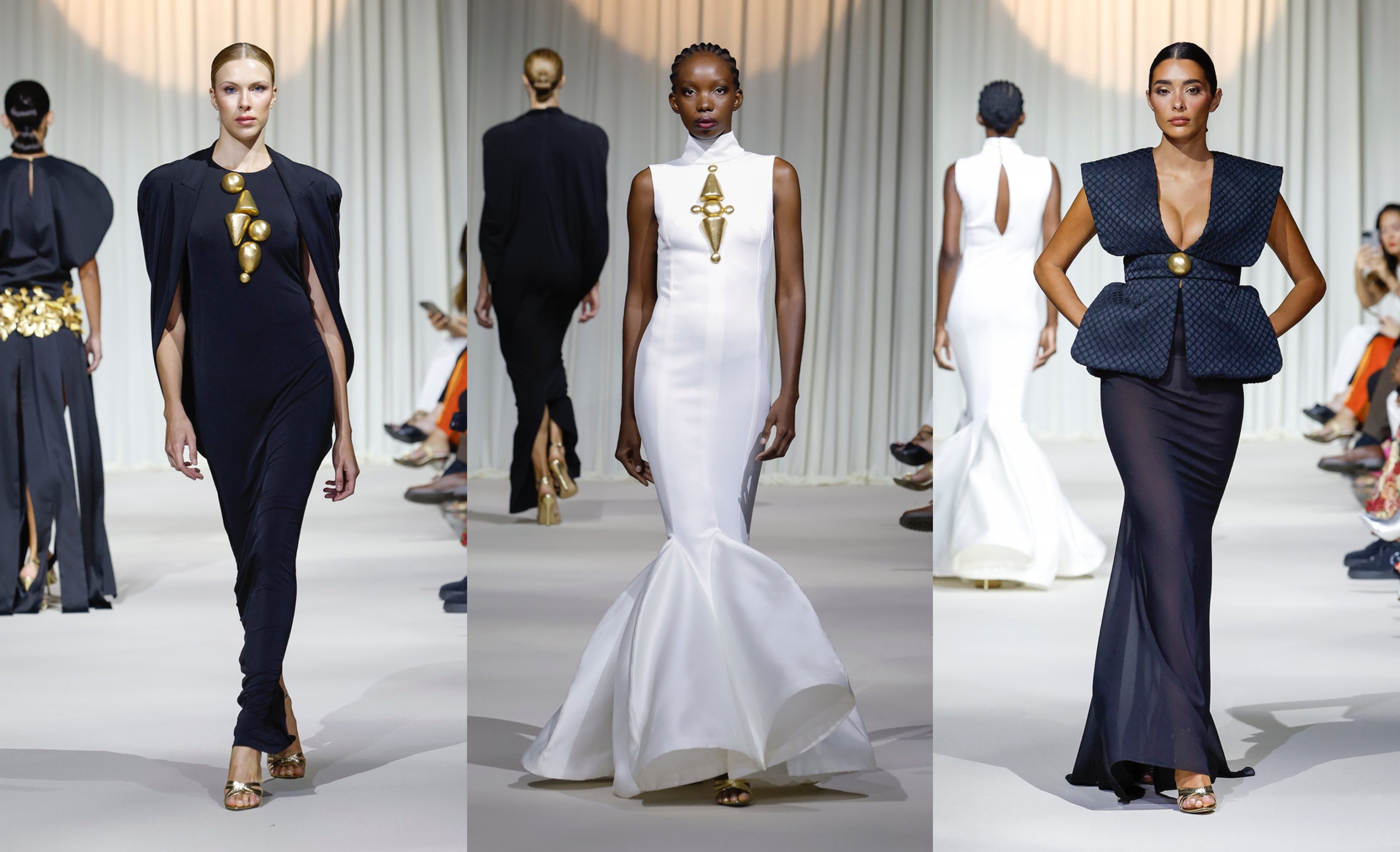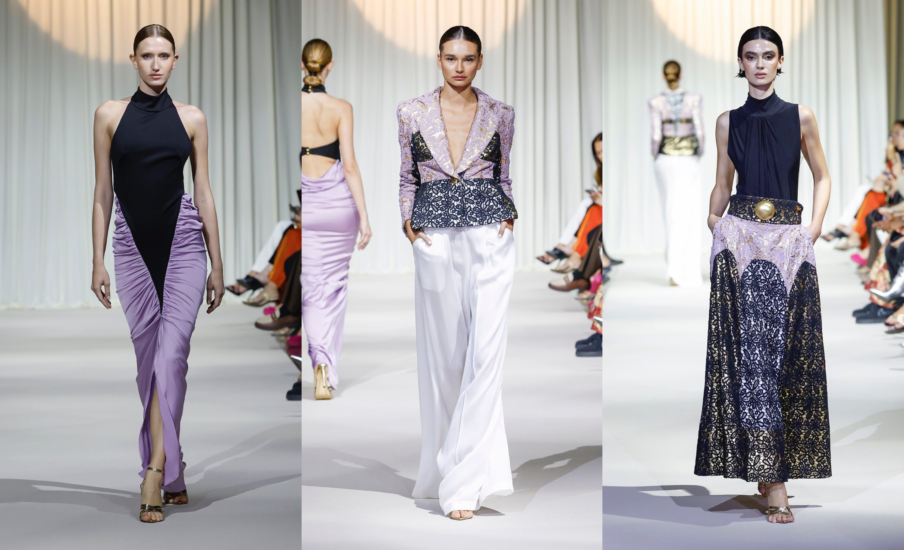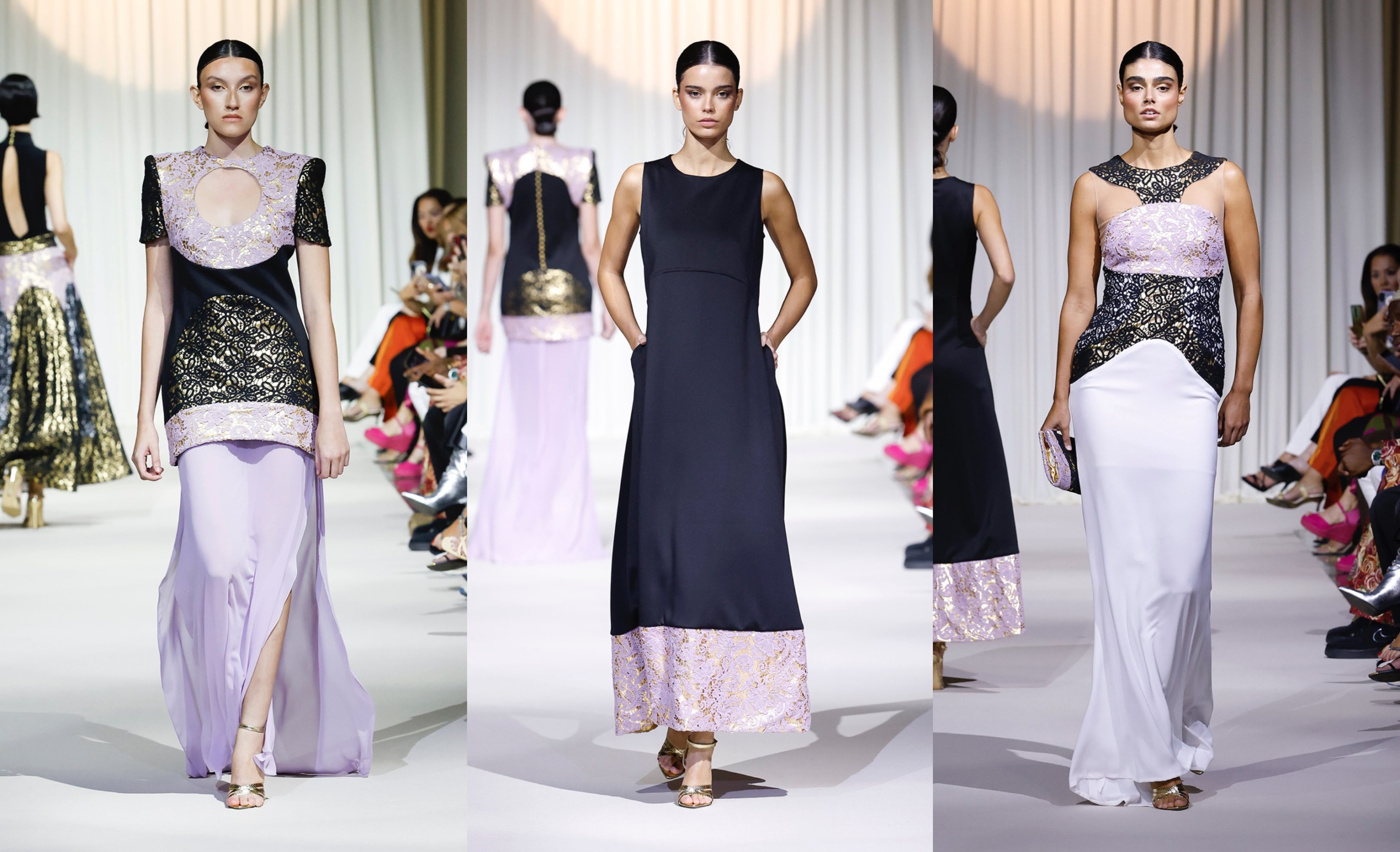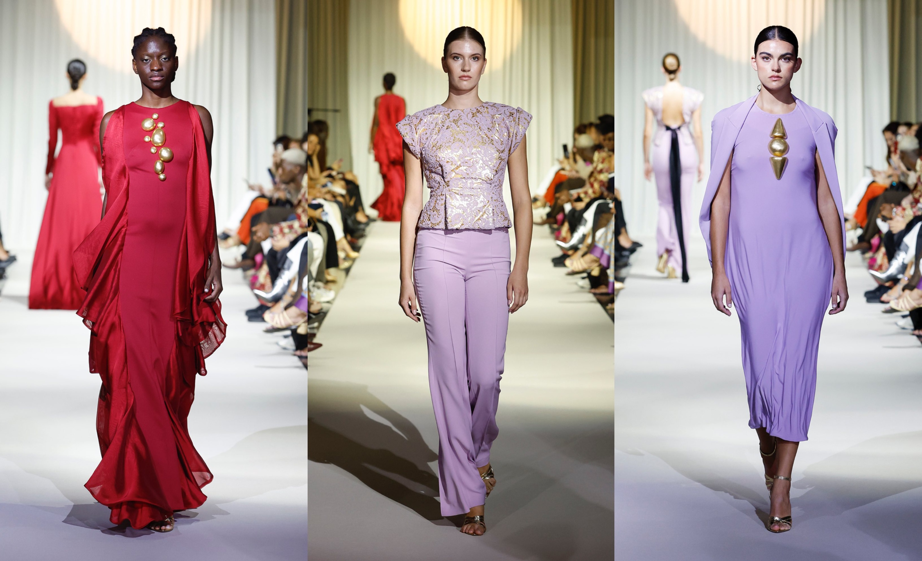 Sobre la pasarela, Urquizar presentó 36 diseños que exploraron la dualidad entre pasión y esperanza, entre fortaleza y fragilidad. La paleta cromática viajó del blanco al negro, pasando por el rojo sangre, los malvas delicados y el oro litúrgico.