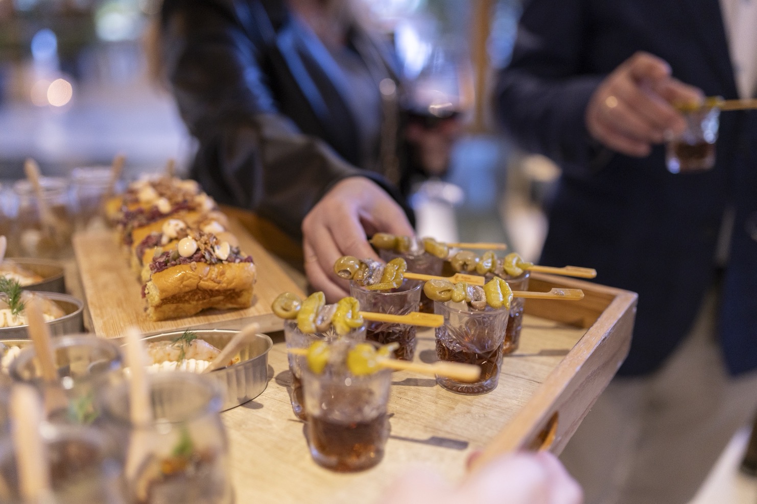 El recorrido de sabores incluyó también queso azul con castaña confitada, las siempre esperadas croquetas de pringá con mayonesa de albahaca, una sabrosa corvina en adobo, brochetas de pollo al curry, y un irresistible mini brioche de steak tartar con cebolla crujiente y salsa sriracha. No faltaron guiños al sur con un serranito de presa ibérica, ni tampoco los dulces finales: mini brownies caseros, una refinada selección de rocas de chocolate especiadas, y el toque fresco y goloso de la piña asada con merengue.