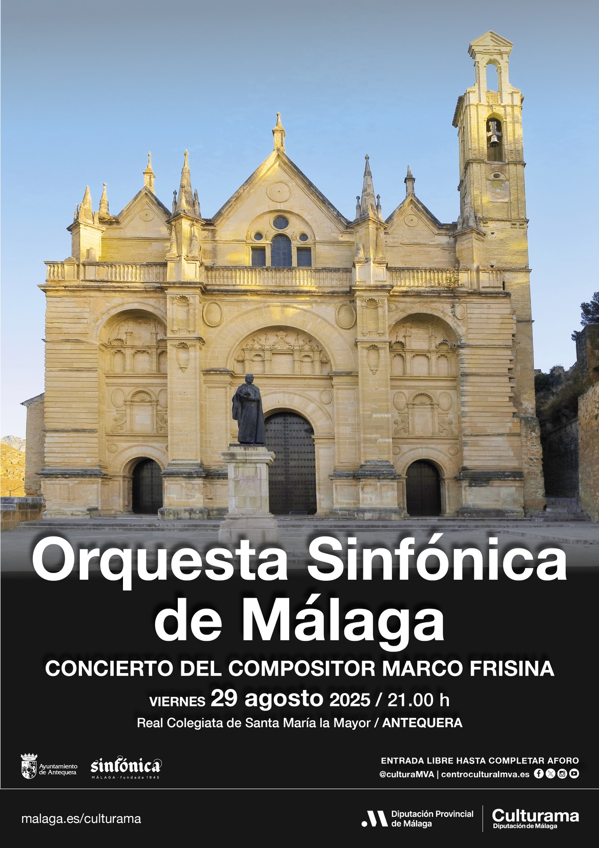El viernes 29 de agosto será el turno de la Orquesta Sinfónica de Málaga, que ofrecerá un concierto en la Real Colegiata de Santa María La Mayor de Antequera. La formación interpretará obras del compositor Marco Frisina en un entorno monumental de gran valor histórico y patrimonial. La cita dará comienzo a las 21.00 horas.