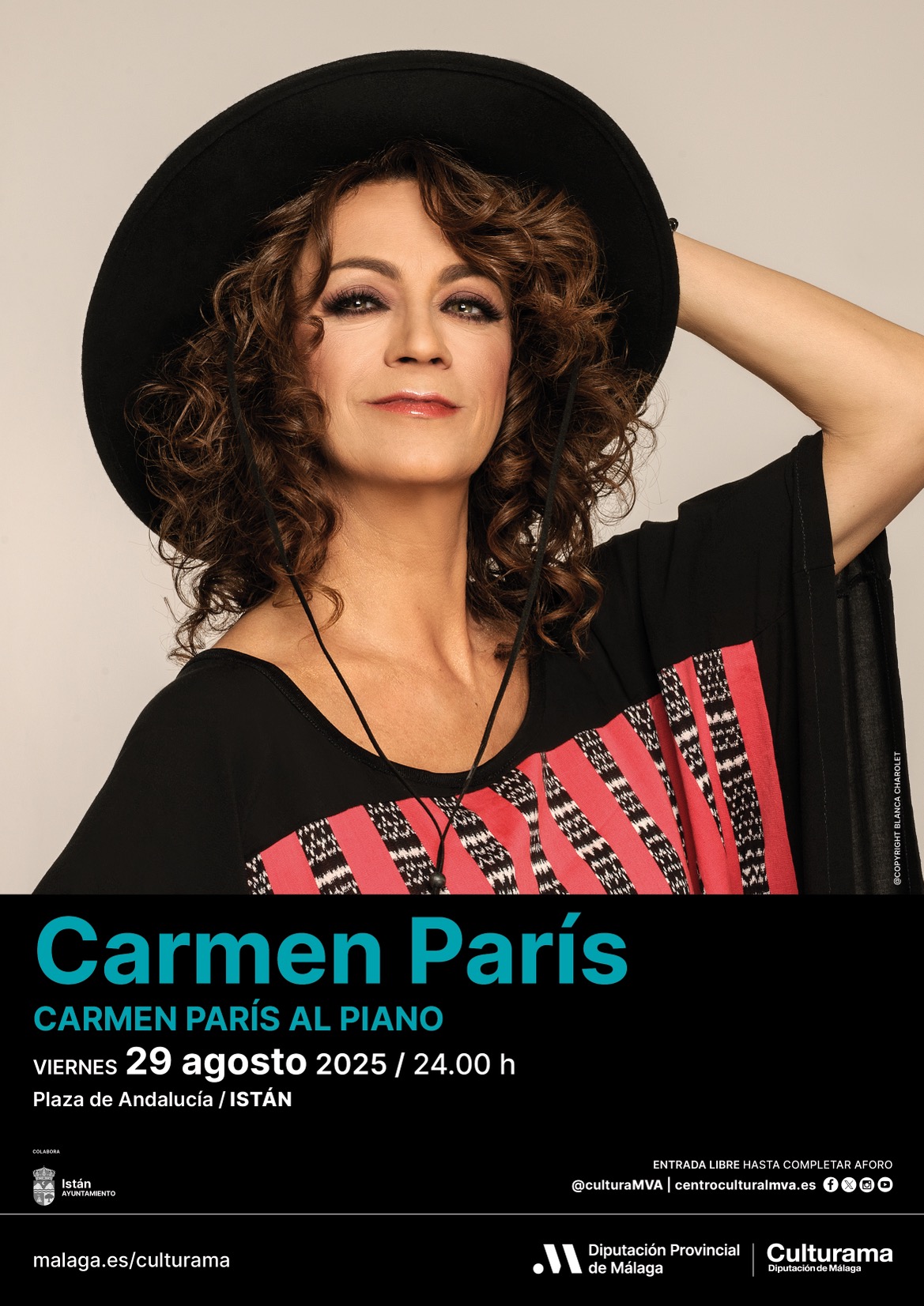 Ese mismo viernes, el municipio de Istán celebrará su tradicional Velá, con 16 espectáculos musicales programados. Entre ellos, destaca la actuación de la cantautora Carmen París, que presentará a las 00.00 horas en la Plaza de Andalucía su espectáculo “París al piano”.